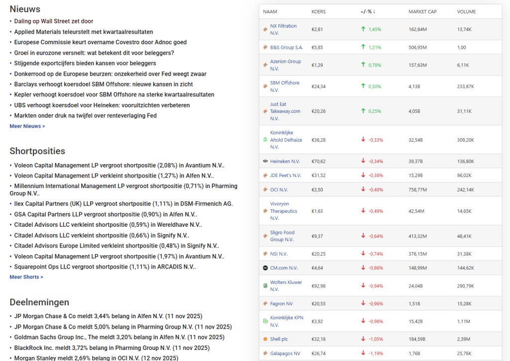 - Nieuws: recente berichten die relevant zijn voor Nederlandse aandelen en het marktsentiment.
