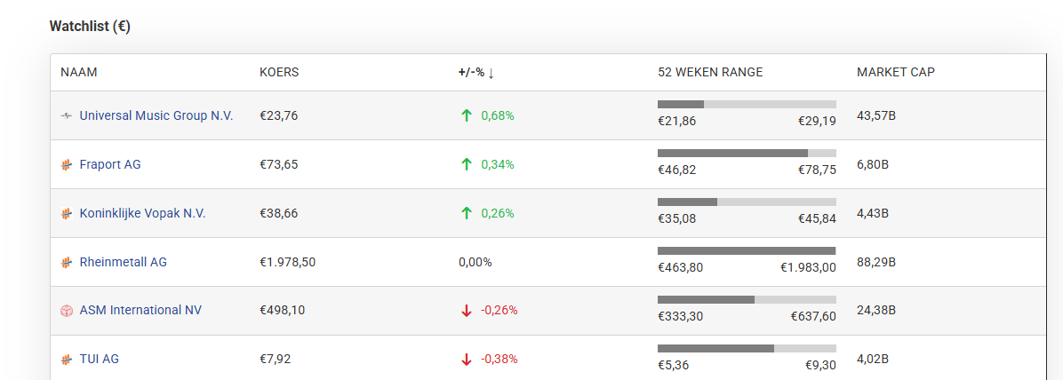 De weergave is verbeterd: zo hebben we onder andere een 52-weeks koersbereik toegevoegd, waardoor direct zichtbaar wordt hoe het aandeel zich de afgelopen periode heeft bewogen. Daarnaast krijgt elk bedrijf voortaan een duidelijke toelichting bij opname op de lijst. In die korte motivatie leggen we uit waarom het aandeel onze aandacht verdient en welke ontwikkelingen we in de gaten houden.