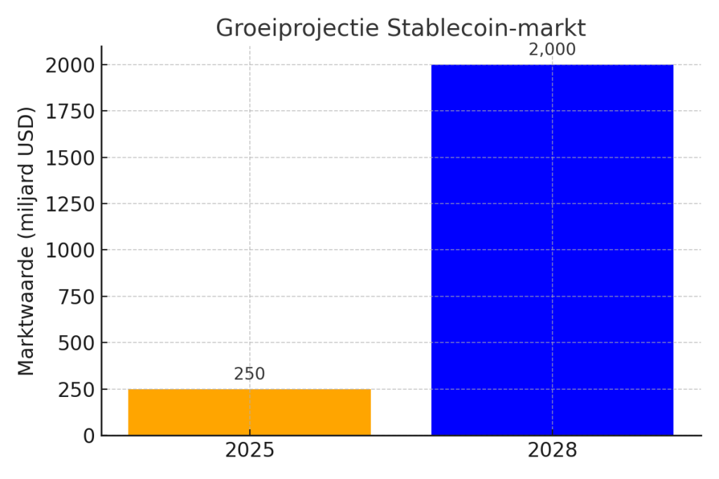 De echte doorbraak volgt wanneer USD-gedekte stablecoins wereldwijd worden geaccepteerd voor retailbetalingen. Denk aan het betalen van boodschappen in Amsterdam, een taxi in Singapore of een hotelovernachting in Buenos Aires – allemaal via dezelfde digitale munt.