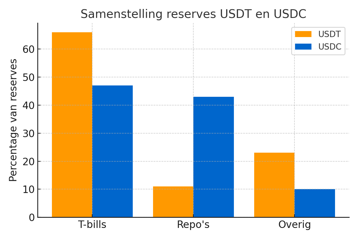 Stablecoins zijn niet alleen relevant voor de cryptomarkt, maar ook voor de wereldwijde obligatiemarkt. Uitgevers houden hun reserves grotendeels in Amerikaanse staatsobligaties (T-bills).
