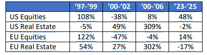Wie vandaag naar de markt kijkt, ziet een duidelijke tweedeling. Aan de ene kant staan AI- en techbedrijven centraal, met enorme kapitaalstromen en hoge waarderingen. Aan de andere kant bungelen vastgoedfondsen onderaan de rendementslijstjes. Eind jaren '90 bleef beursgenoteerd vastgoed fors achter bij de aandelenmarkt, maar na het barsten van de internetzeepbel presteerde vastgoed juist extreem goed.